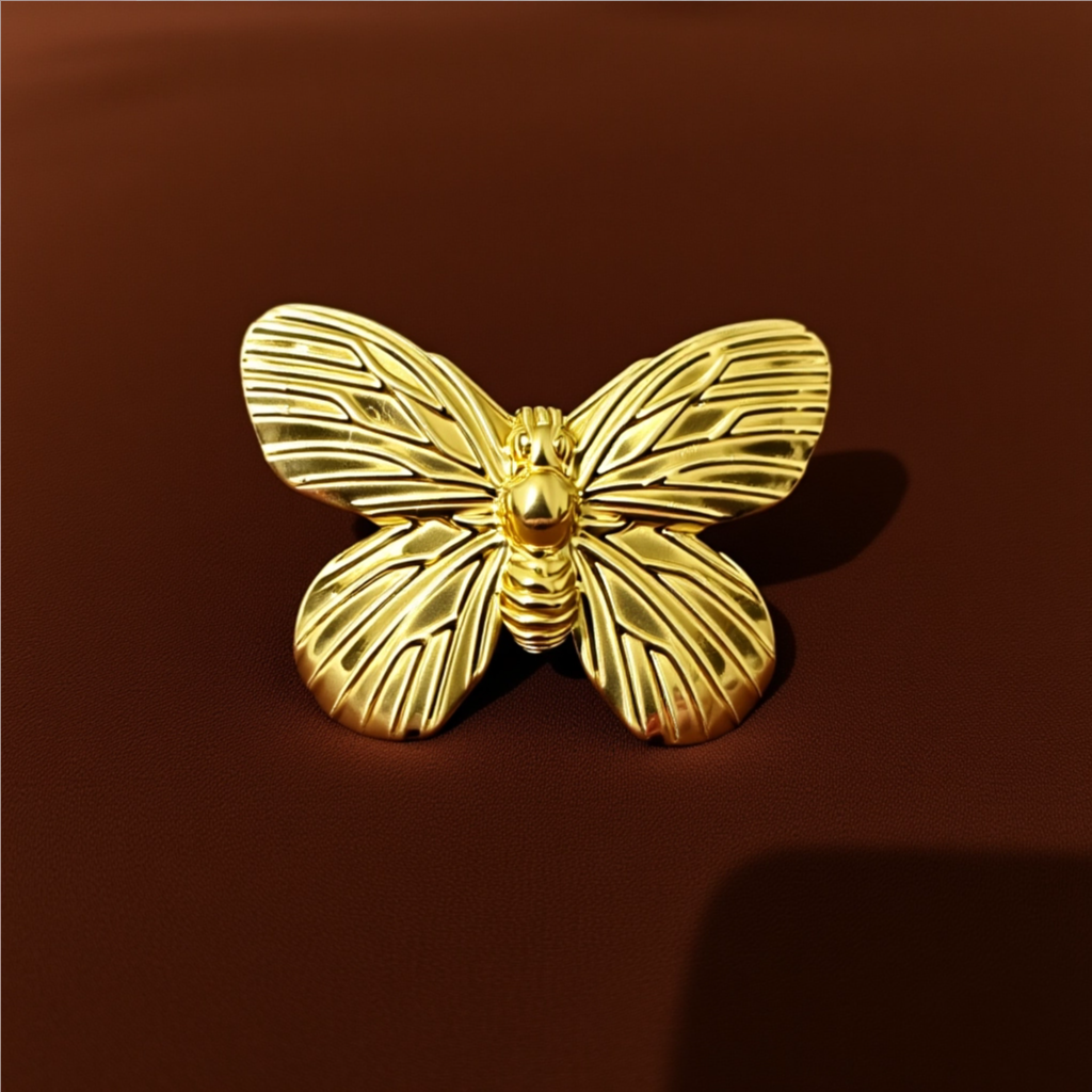 Dieser auffällige Ring mit einem großen Schmetterling in Goldbeschichtung besticht durch seine markante und übergroße Form. Das Design betont Einzigartigkeit und sein ausdrucksstarkes Erscheinungsbild passt perfekt zu allen, die im Mittelpunkt stehen und ein modisches Accessoire tragen möchten, das nicht unbemerkt bleibt. Ideal für mutige und selbstbewusste Menschen, die einen außergewöhnlichen Stil schätzen.