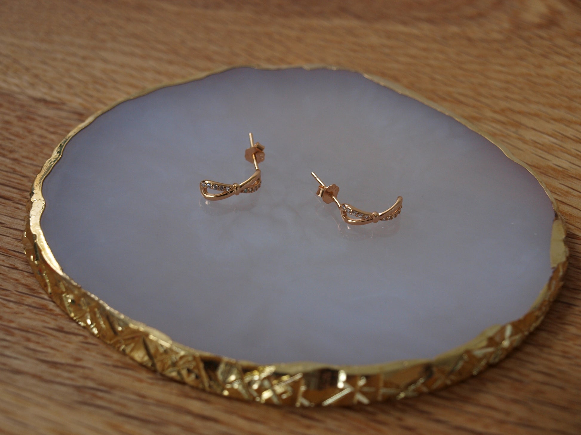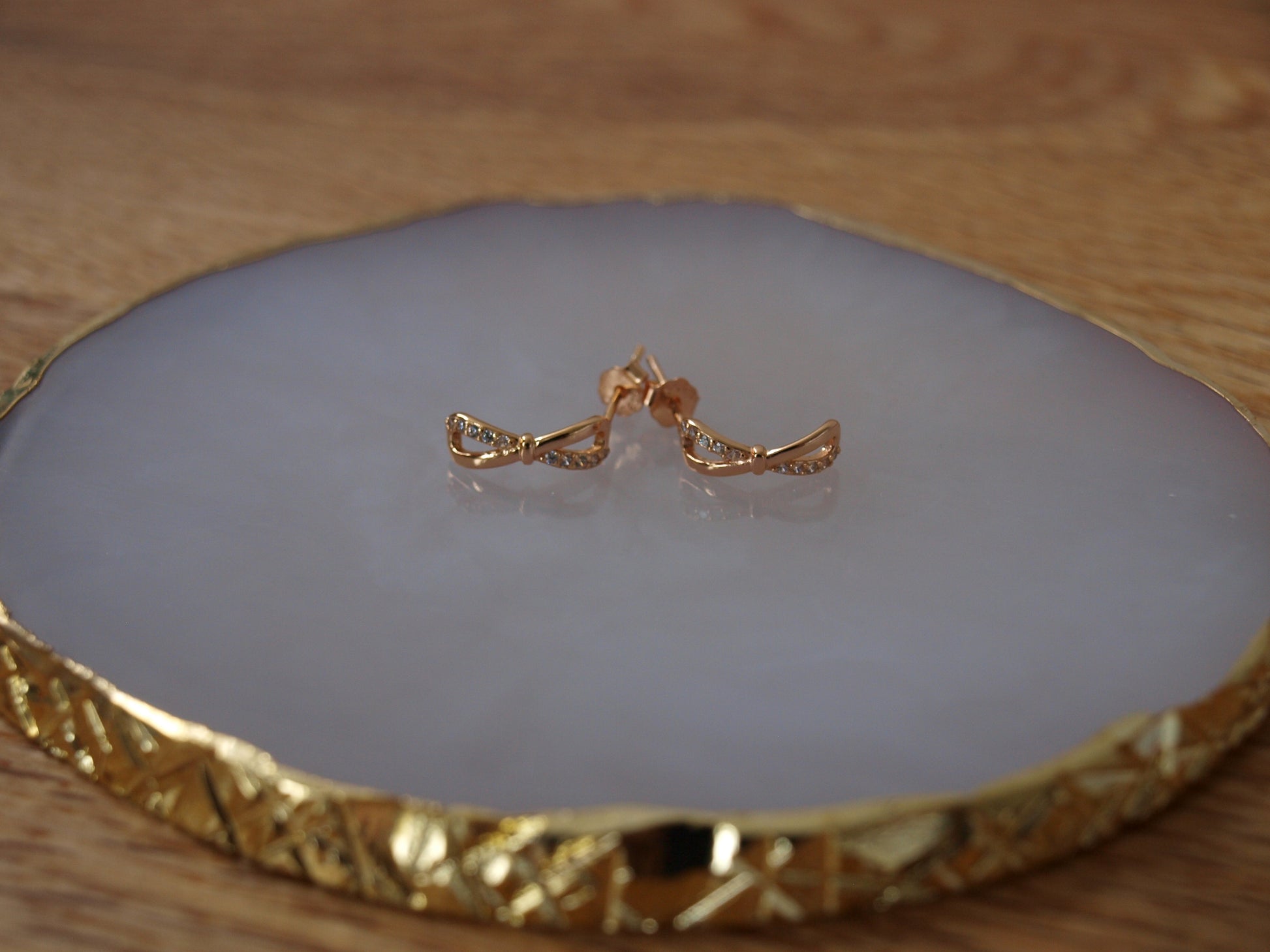 Dodajte dašak nježnosti svojoj kolekciji nakita s ovim diskretnim naušnicama u obliku mašnice obojanim u predivnu rozo-zlatnu nijansu. Mali cirkoni sjaje suptilno, pružajući vam savršen spoj elegancije i razigranosti koji će upotpuniti svaki vaš izgled.
