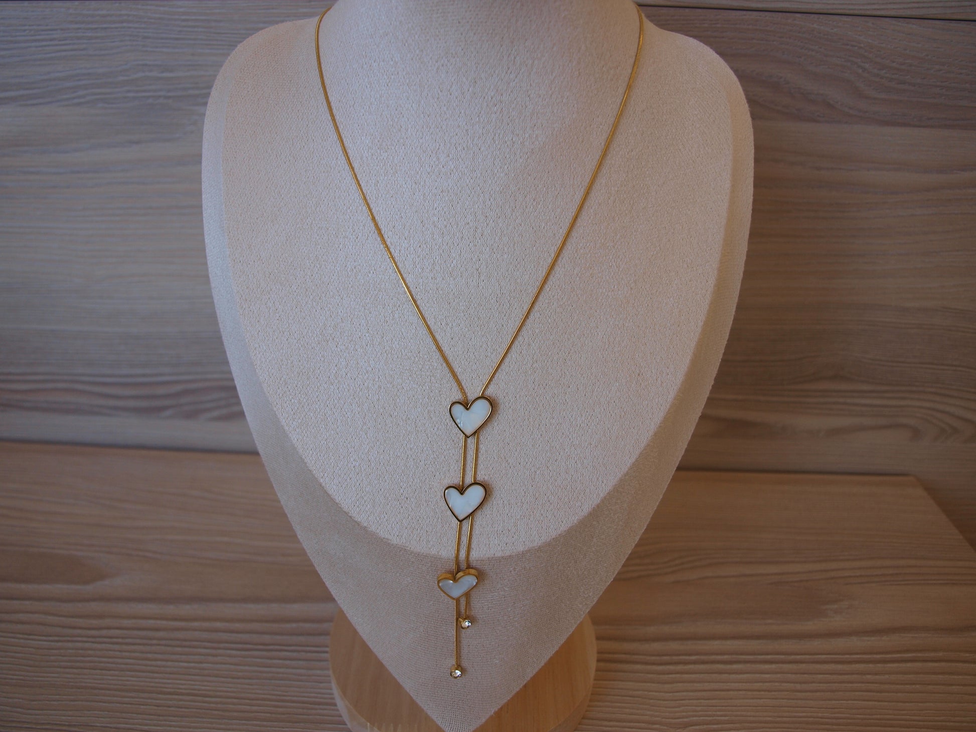 Ovu prekrasnu ogrlicu krase tri nježna privjeska u obliku srca izrađena od sedefa. Sedef donosi jedinstveni sjaj i prelivanje boja, čineći svaku ogrlicu posebnom i neponovljivom.