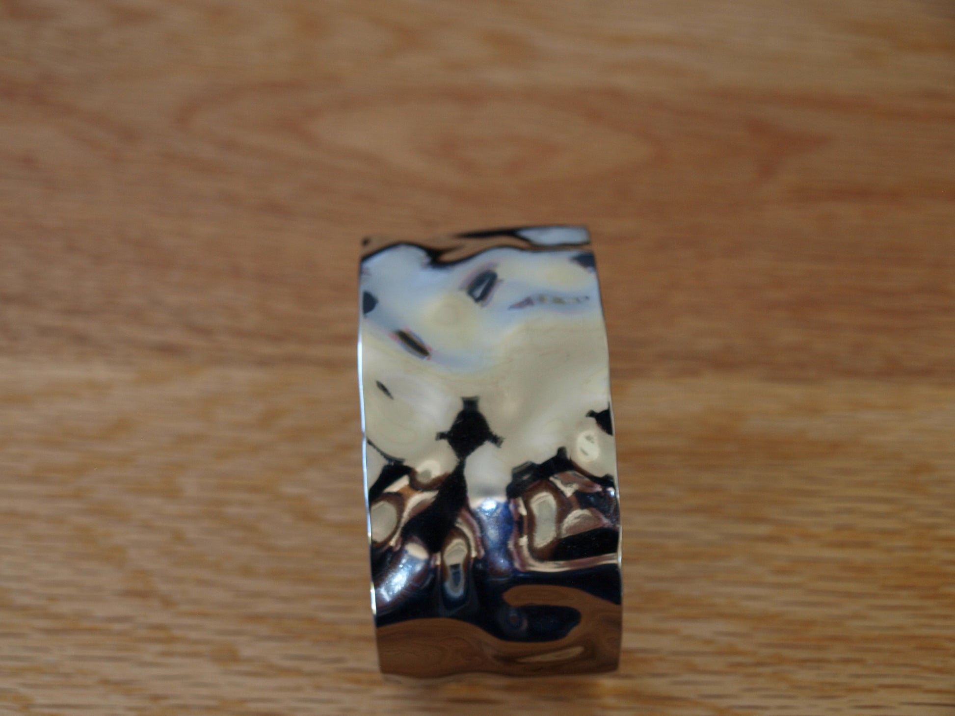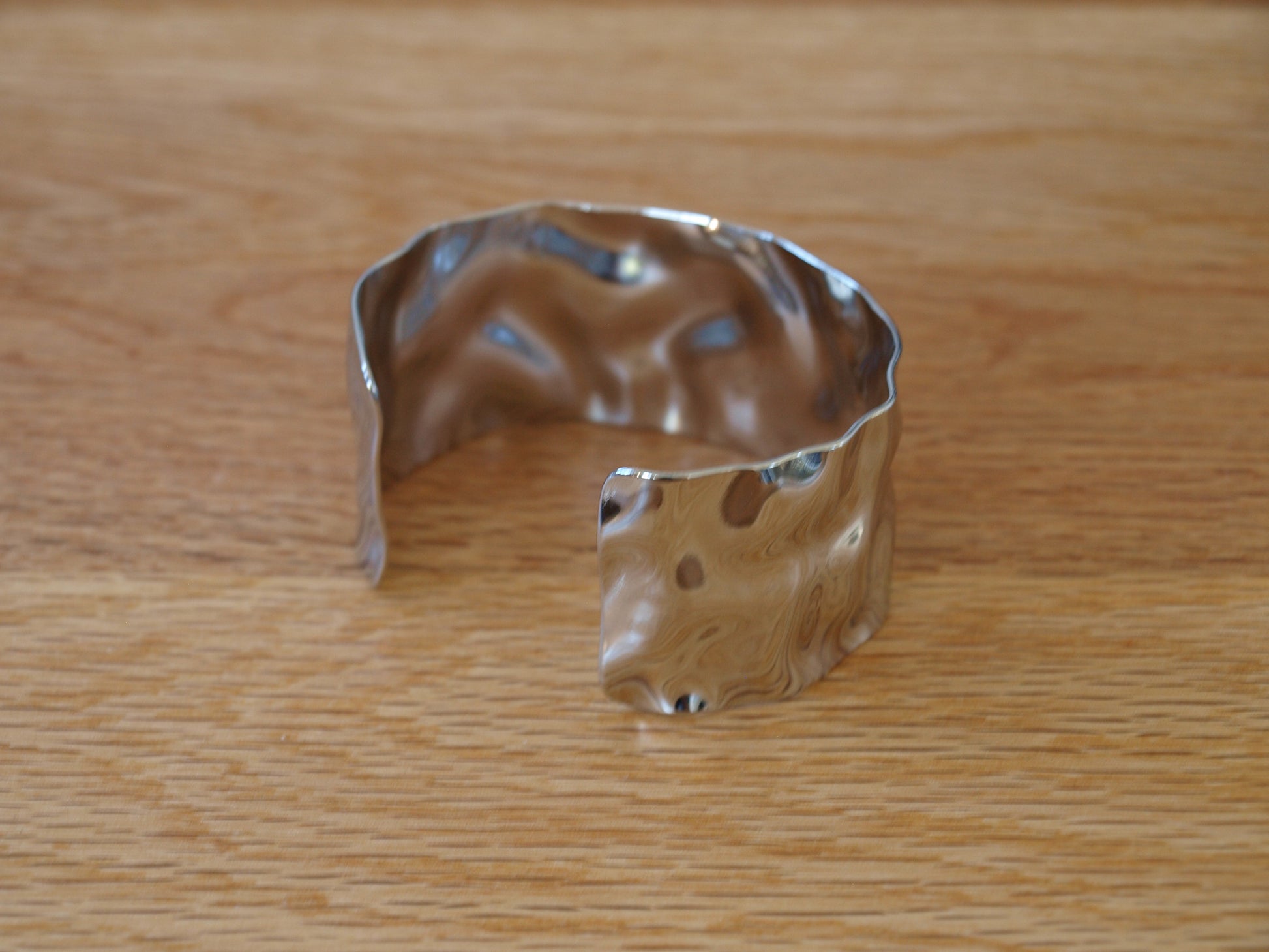 Ova narukvica u boji srebra dolazi iz jednog komada s neravnom površinom koja ističe njezinu sirovu, neukroćenu ljepotu. Njezina jedinstvena tekstura privlači poglede i dodaje odvažan detalj svakom stilu, savršena za one koji vole nositi nešto originalno i hrabro.