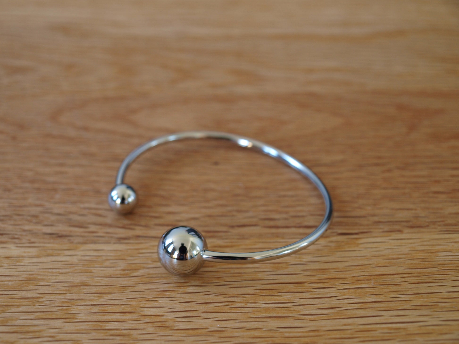 Ova jednostavna narukvica u srebrnoj boji ističe se kuglama različitih dimenzija na završecima, dodajući joj dinamičan i neočekivan šarm. Savršen izbor za one koji žele suptilan, ali odvažan detalj koji naglašava individualnost.