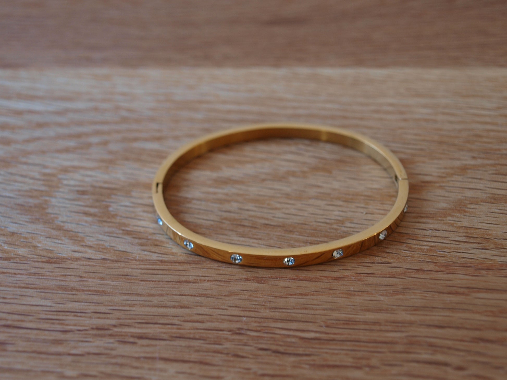 Ova kompaktna narukvica sa rafiniranim nizom cirkona i elegantnom pozlatom donosi dozu smjelosti i sofisticiranosti svakom izgledu. Njena pažljivo dizajnirana glamuroznost naglašava vaš jedinstveni stil s odvažnim sjajem koji ne prolazi nezapaženo.