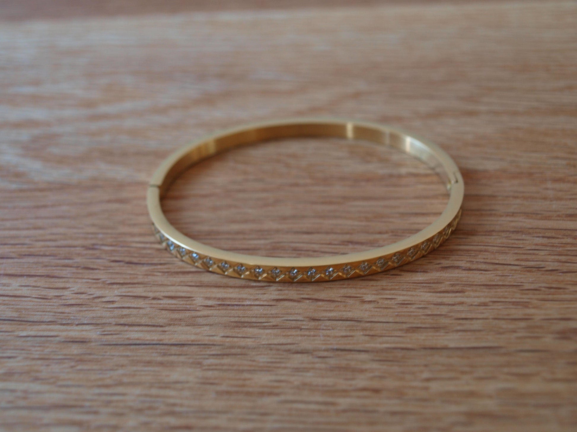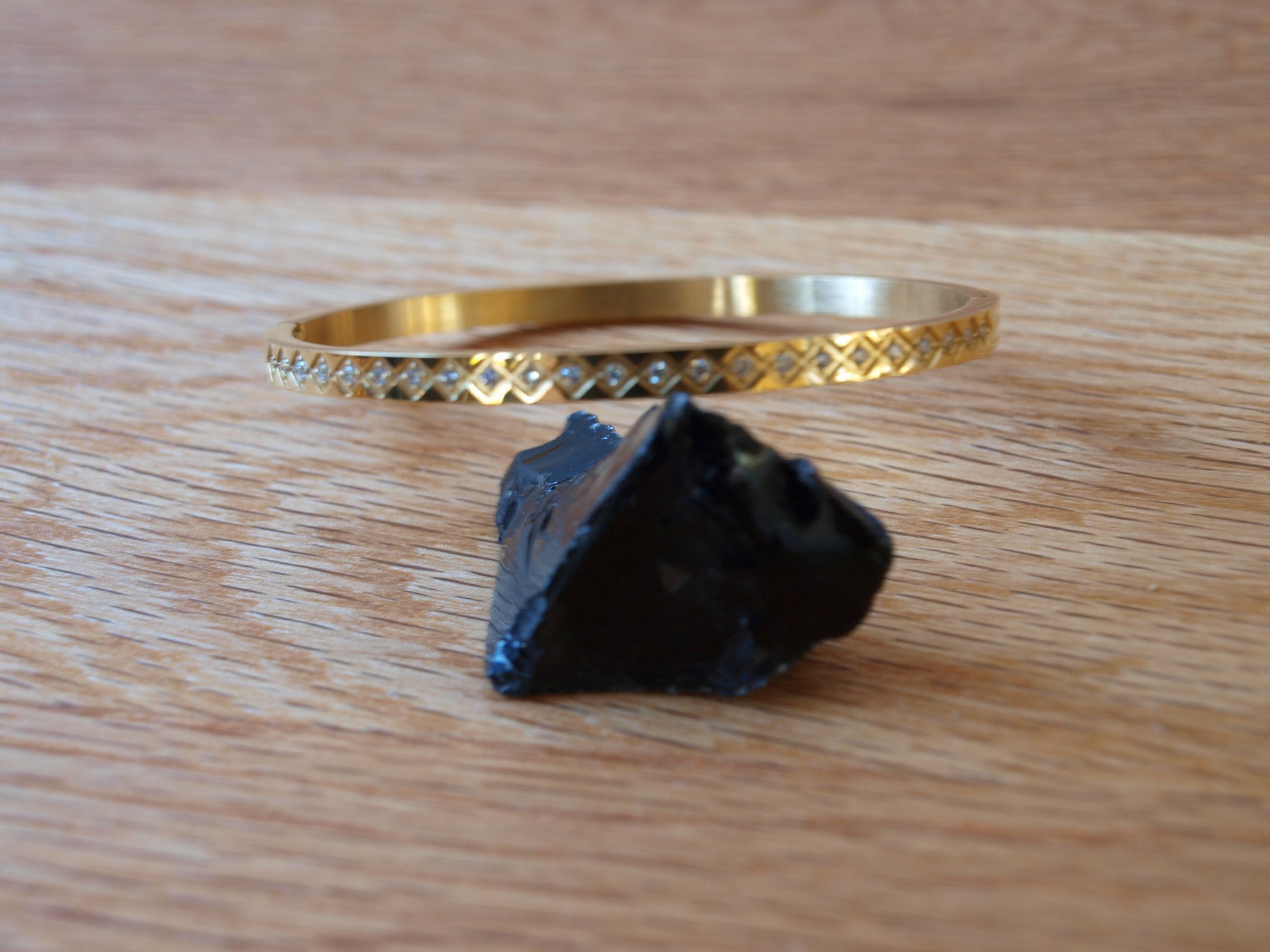 Ova retro kompaktna narukvica sa zlatnom pozlatom ističe se nizom cirkona raspoređenih u obliku dijamanta, donoseći sofisticiran i odvažan izgled. Savršena za one koji žele svojim stilom istaknuti jedinstvenu eleganciju i hrabrost. Elegantna i upečatljiva, idealna za svaki outfit koji zahtijeva dozu luksuza i karaktera.