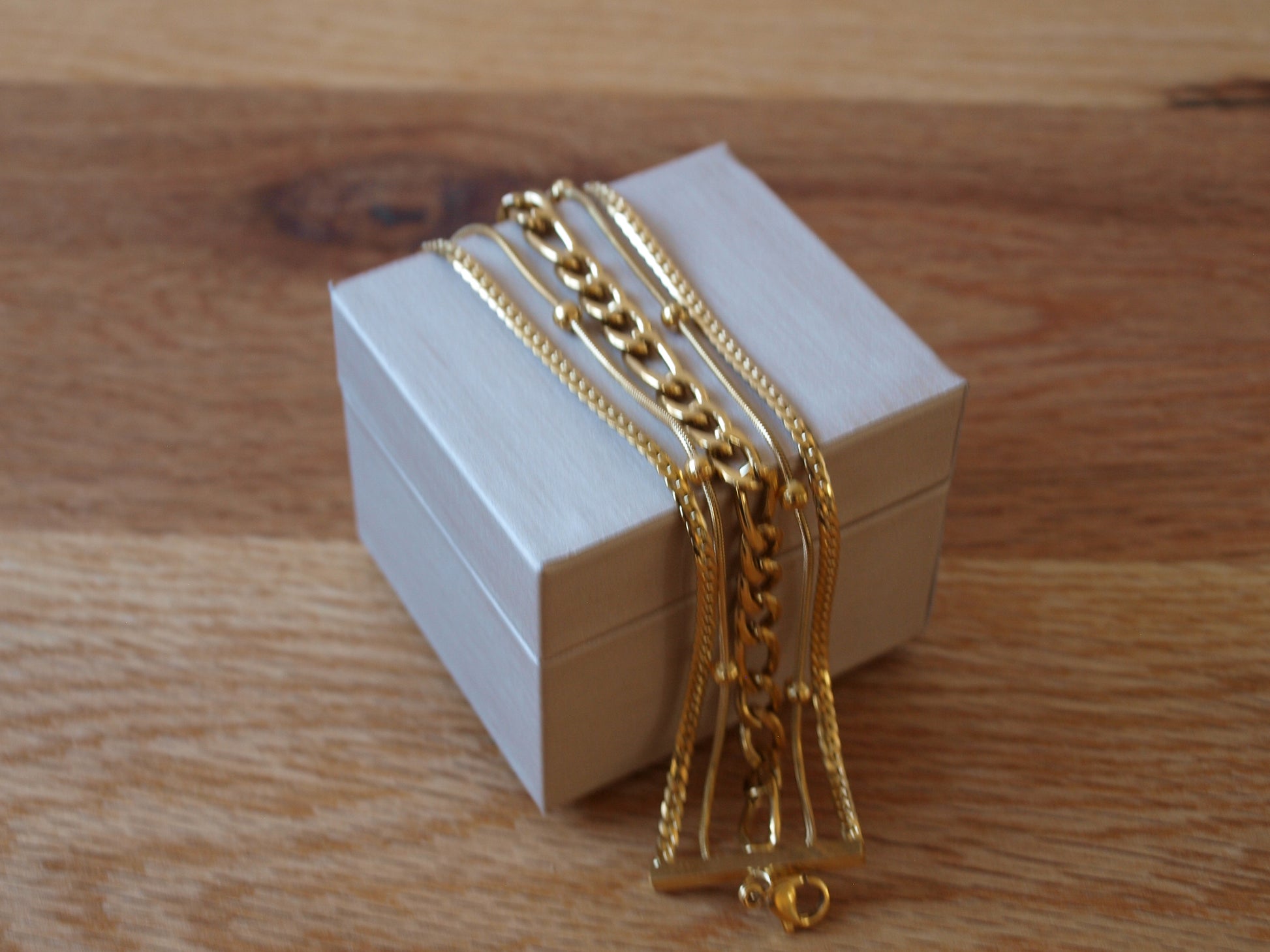 Osvježite svoj stil s ovom smjelom narukvicom koja dolazi u pet različitih nizova, svi izrađeni od sjajne pozlate. Svaki niz donosi jedinstvenu teksturu i dinamiku te sofisticiran izgled koji neće ostati nezapažen.