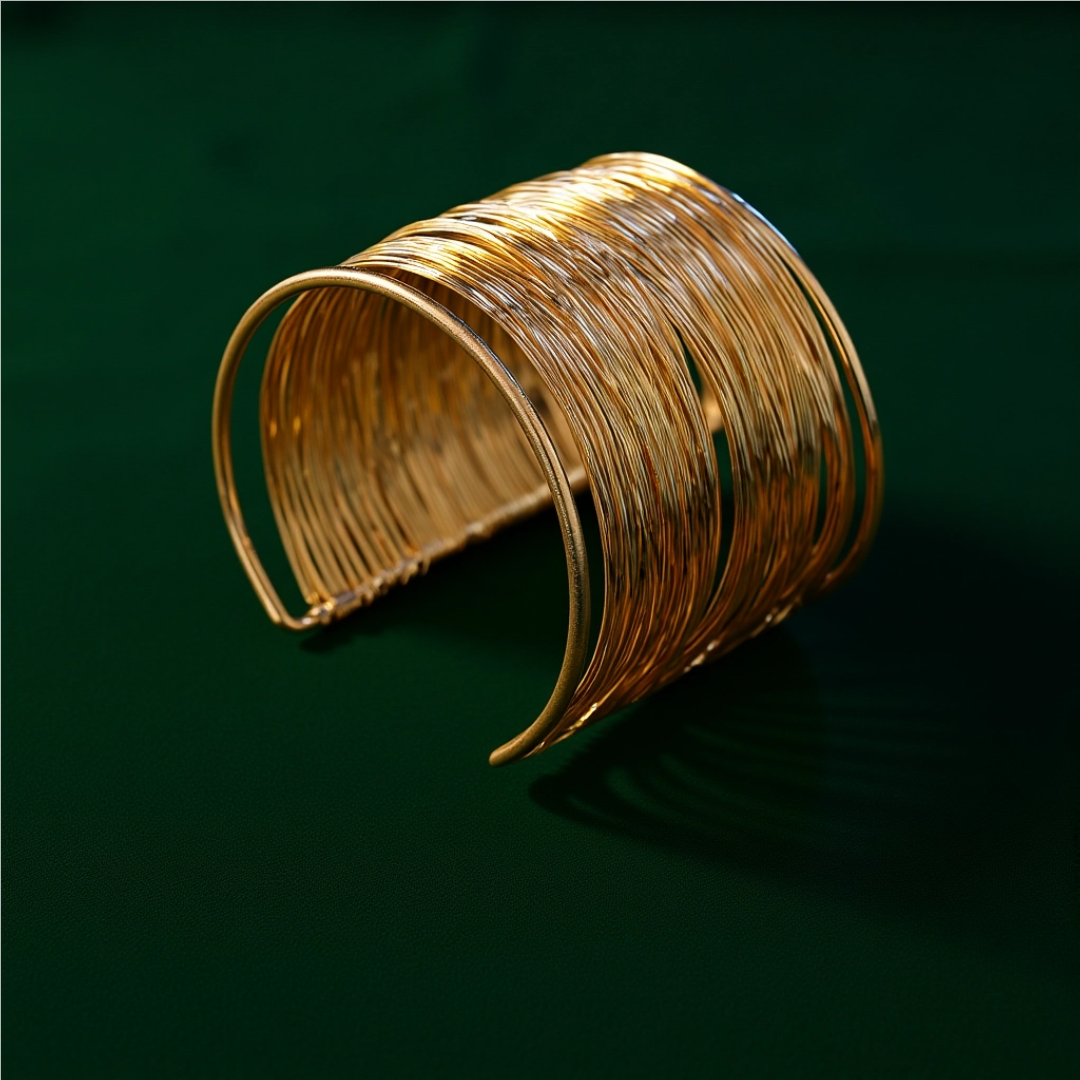 Ova predimenzionirana narukvica djeluje kao da je utkano tisuću niti u jedan zapanjujući sjajni komad. Njezin upečatljiv dizajn nećete moći zanemariti, savršen za one koji žele odvažno istaknuti svoj stil i privući poglede gdje god se pojave.