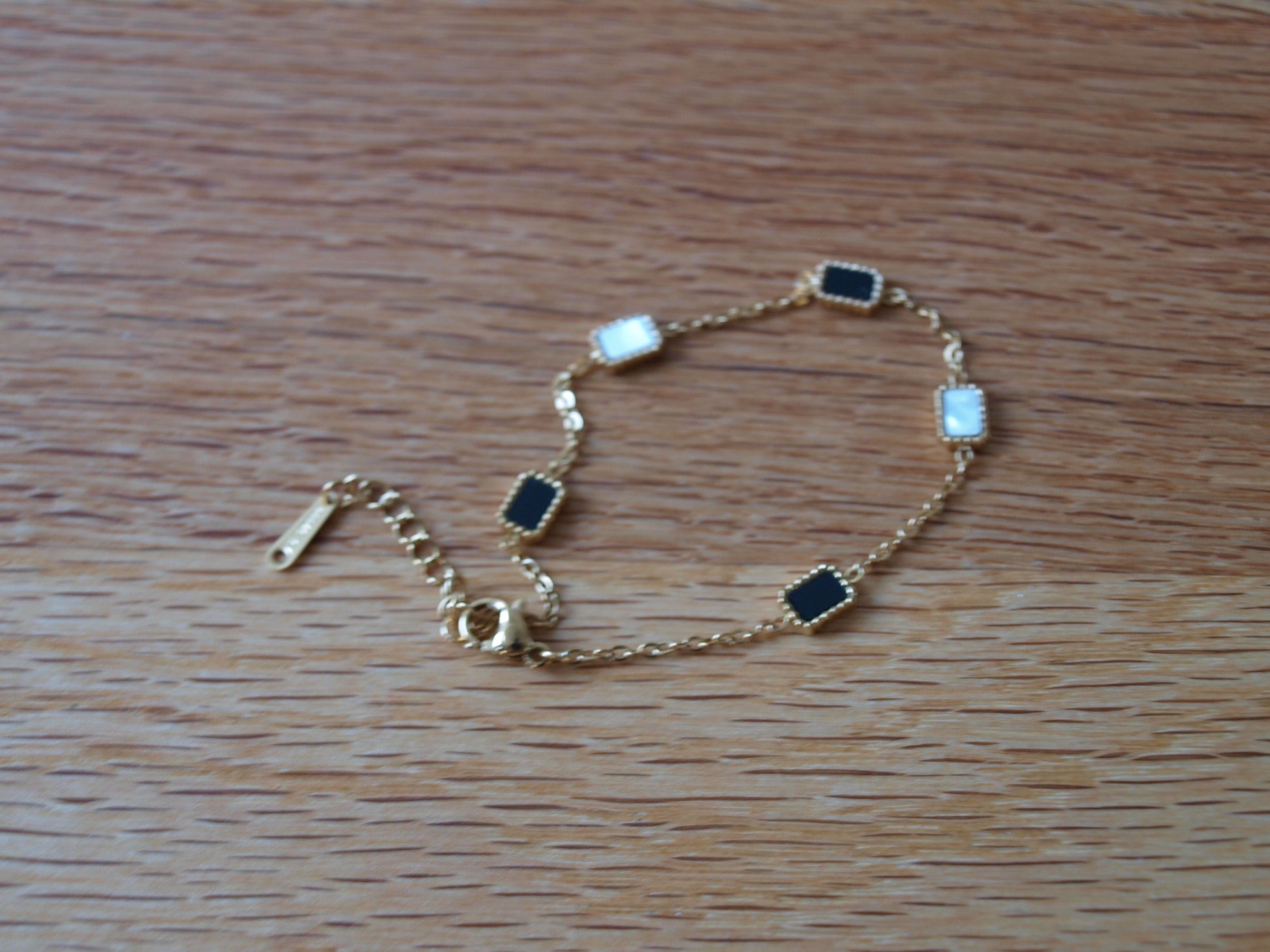 Ova narukvica s kombinacijom crnih i bijelih detalja u zlatnoj pozlati donosi zabavan i moderan dodir svakom outfitu. Njezin jedinstveni kontrast boja ističe se uz lagani sjaj pozlate, savršena za igru stilova i izražavanje osobnosti kroz detalje.