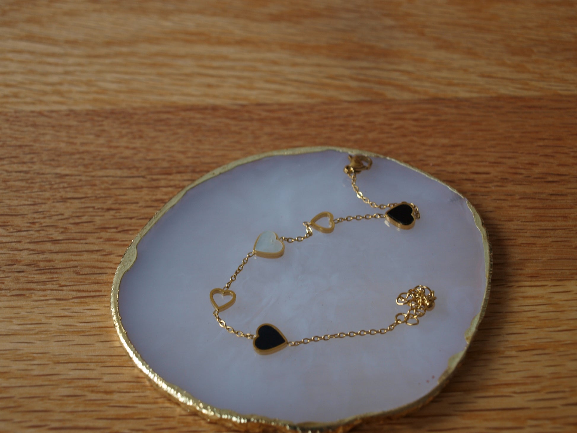 Ova nježna narukvica donosi niz srdaca u crnoj, bijeloj i prozirnoj boji, sve u elegantnoj pozlati. Savršena je za one koji vole malo razigranosti uz dozu sofisticiranosti.