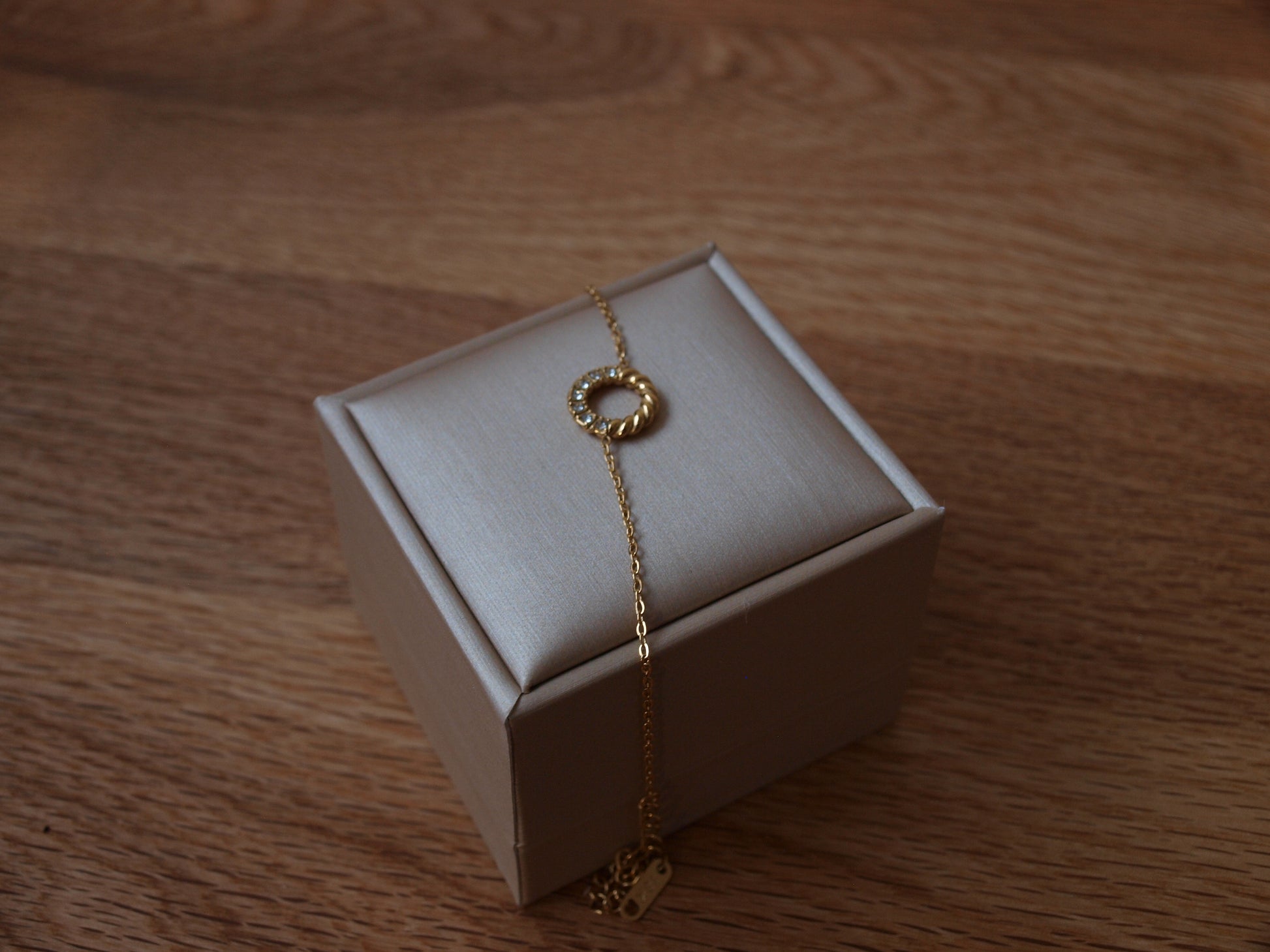 Ova narukvica savršeno spaja glamur i sjaj — pola je zlatna, a pola ukrašena blistavim cirkonima pozlatom. Dodajte dašak razigranosti i elegancije svom izdanju s ovim neodoljivim modnim dodatkom!