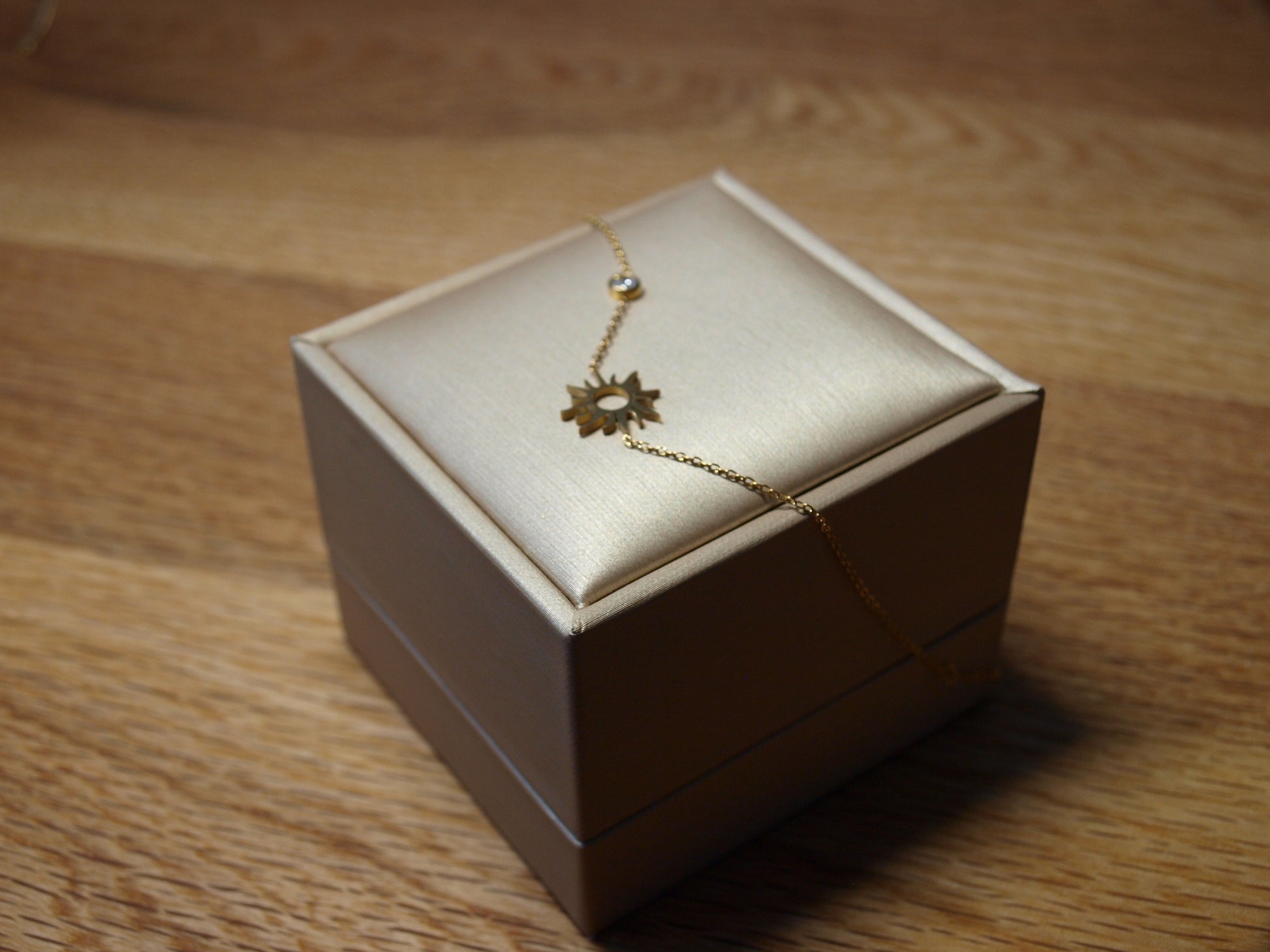 Ova razigrana narukvica ima sjajno sunce u svom središtu, uz koje se nalazi blistavi cirkon u blizini elegantnog pozlatnog završetka. Dodajte malo sunčane radosti svome danu.