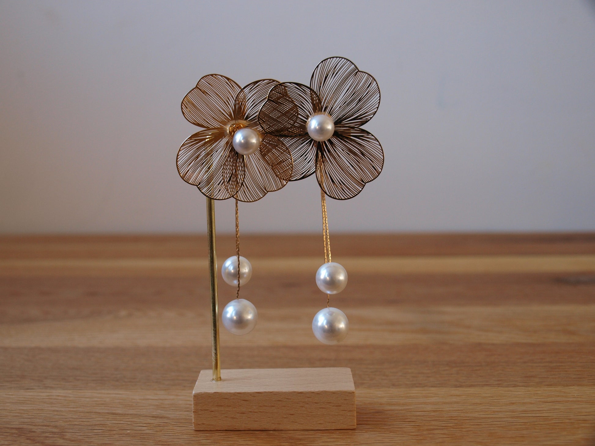 Ove naušnice oduševljavaju velikim, predimenzioniranim cvjetovima koji donose smijeh i vedrinu svakom izgledu. Na kraju vise profinjeni dijelovi ukrašeni biserima koji se lagano njišu, čineći svaki pokret posebnim i razigranim. U boji zlata, savršene za one koji vole istaknuti svoj stil s dozom zabave i elegancije.