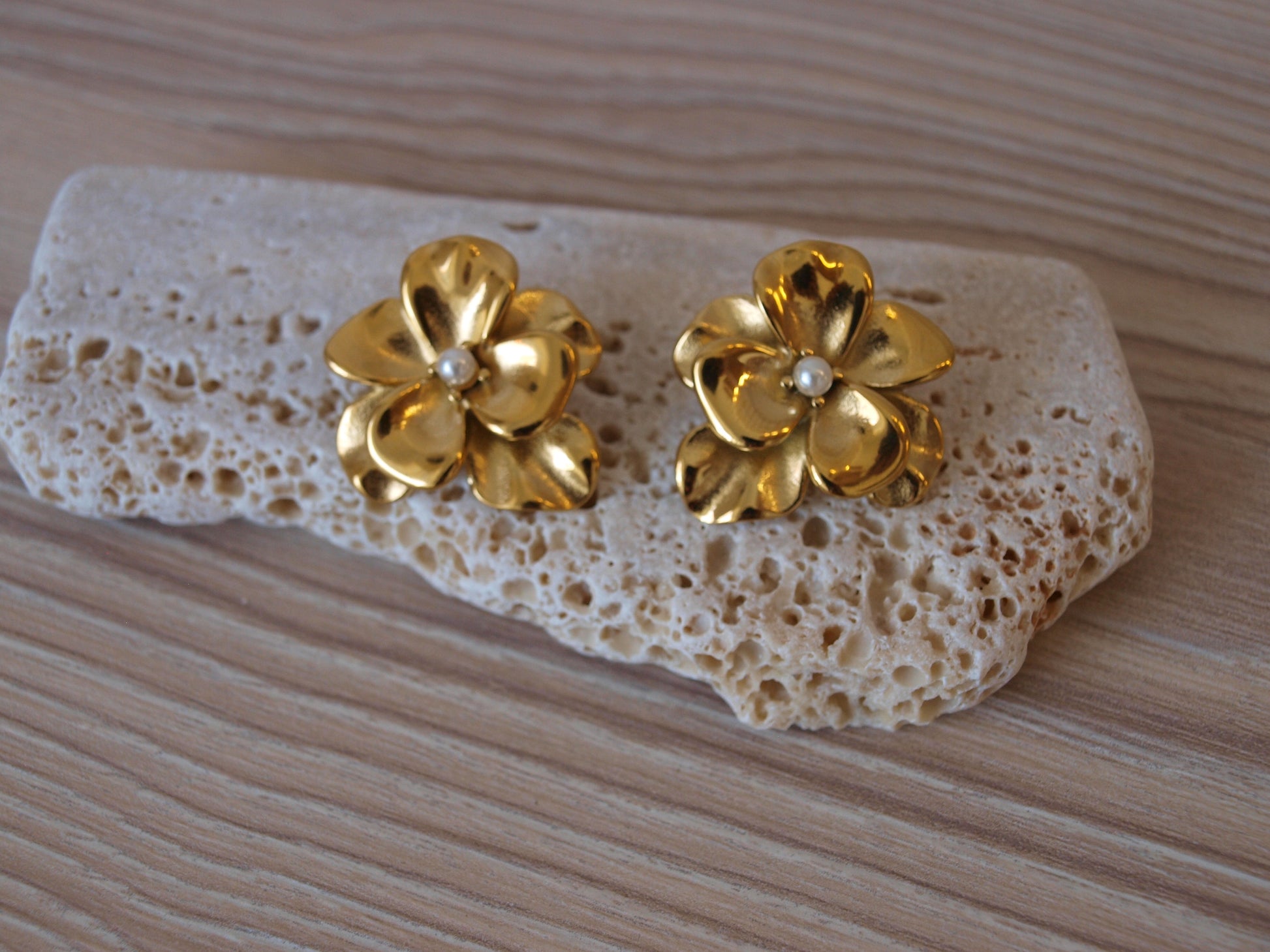 Dodajte razigrani sjaj svojoj kolekciji nakita s ovim naušnicama u obliku cvijeta, pozlaćenim za dugotrajni sjaj. Svaki cvijet nosi nježan biser u sredini, stvarajući savršen spoj elegancije i razigranosti. Idealne su za osvježenje svakog outfita i privlačenje pogleda na vašu prirodnu ljepotu.