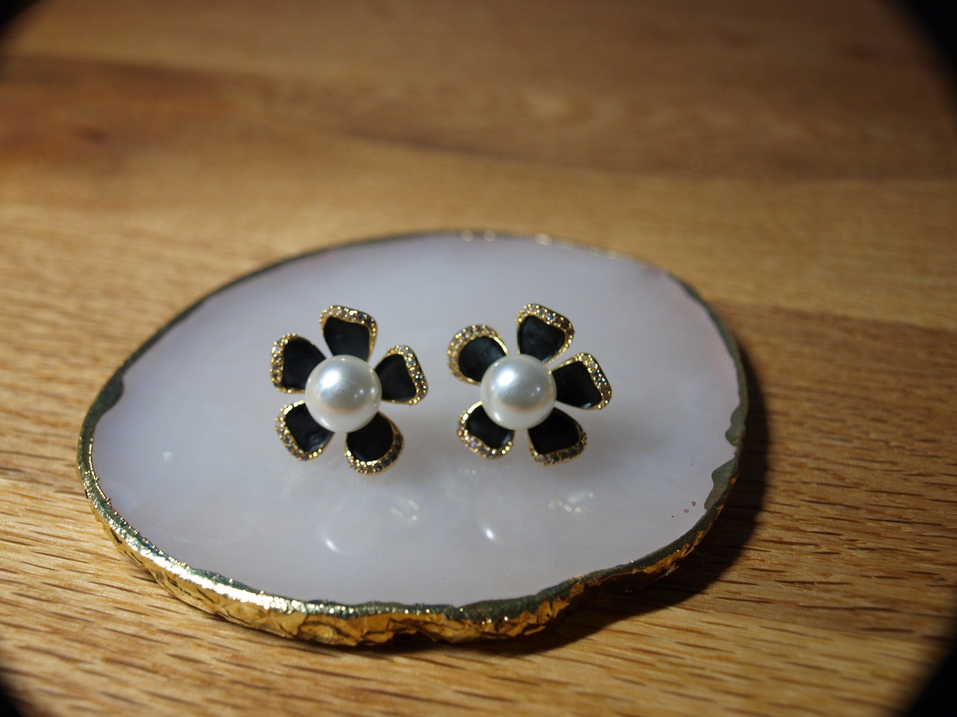 Dodajte dašak elegancije i igre stila s ovim crnim naušnicama u obliku cvijetića, ukrašenim velikim biserom u sredini. Savršene za one koji vole suptilnu ali upečatljivu modu, ove naušnice su idealan dodatak za svaku priliku koja traži malo zabave i šarma.