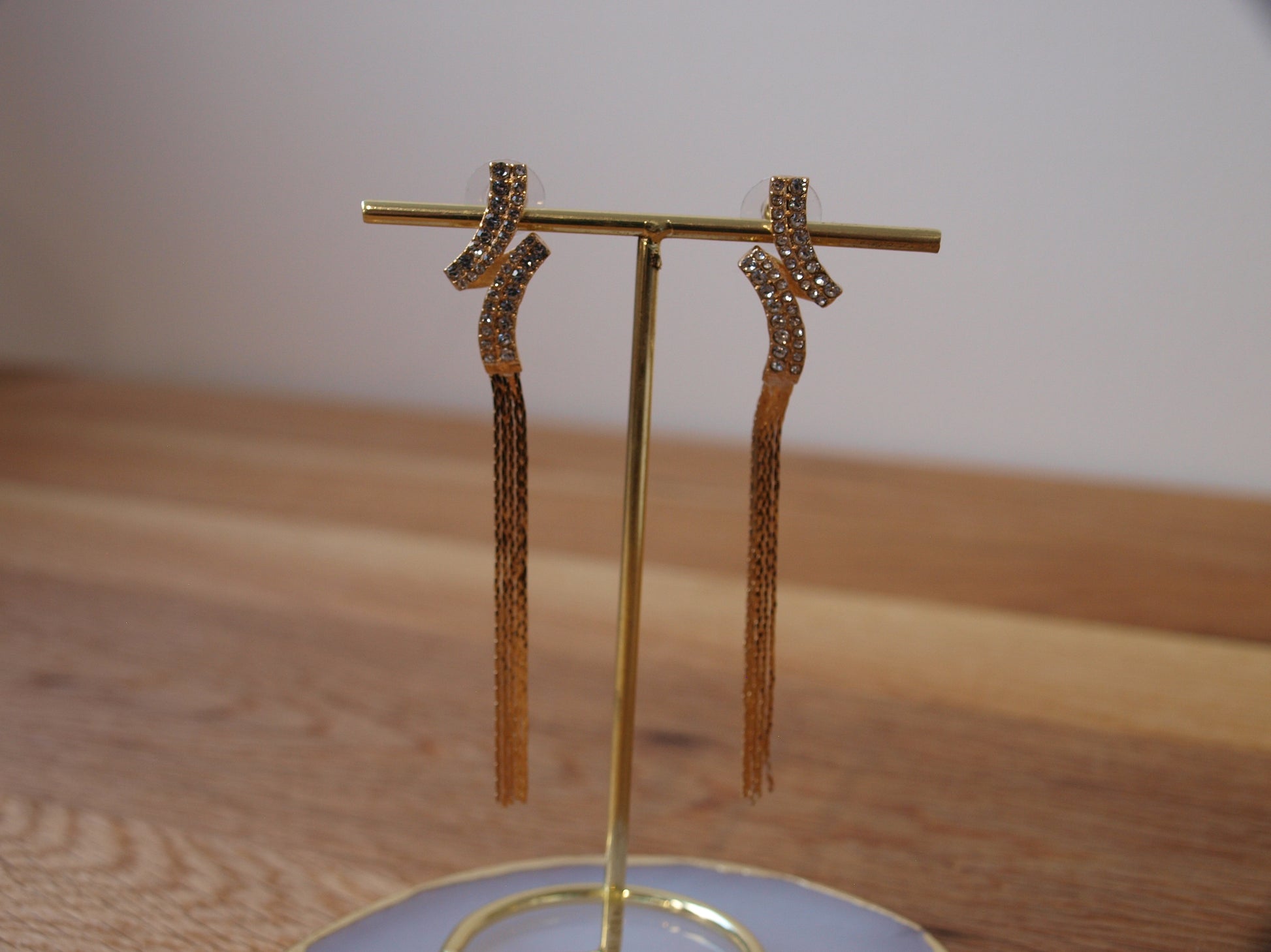 Ove svečane viseće naušnice oduševljavaju zakrivljenim dizajnom i zlatnim sjajem, dodatno naglašenim blistavim cirkonima. Idealne su za dodati dozu igre i elegancije svakom outfitu, stvarajući zabavan, ali sofisticiran izgled koji privlači poglede. Savršene za one koji vole da zasijaju s daškom razigranosti.