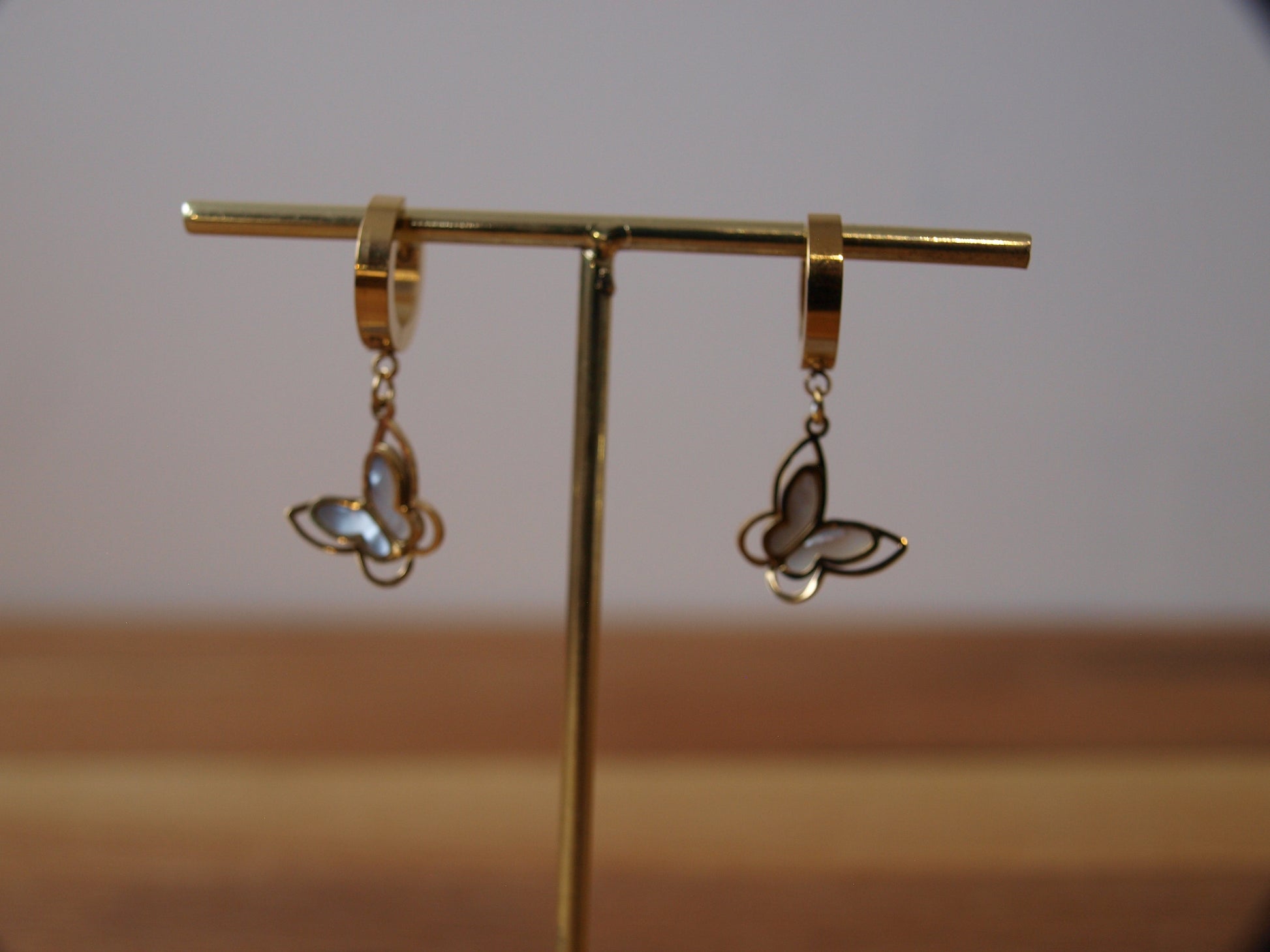 Ove naušnice sa pozlatom oživljavaju svaki izgled razigranim visećim leptirićima u prelijepim sedefastim bojama. Lagane i šarmantne, savršene su za dodavanje duha igre i nežnosti vašem stilu svaki dan.