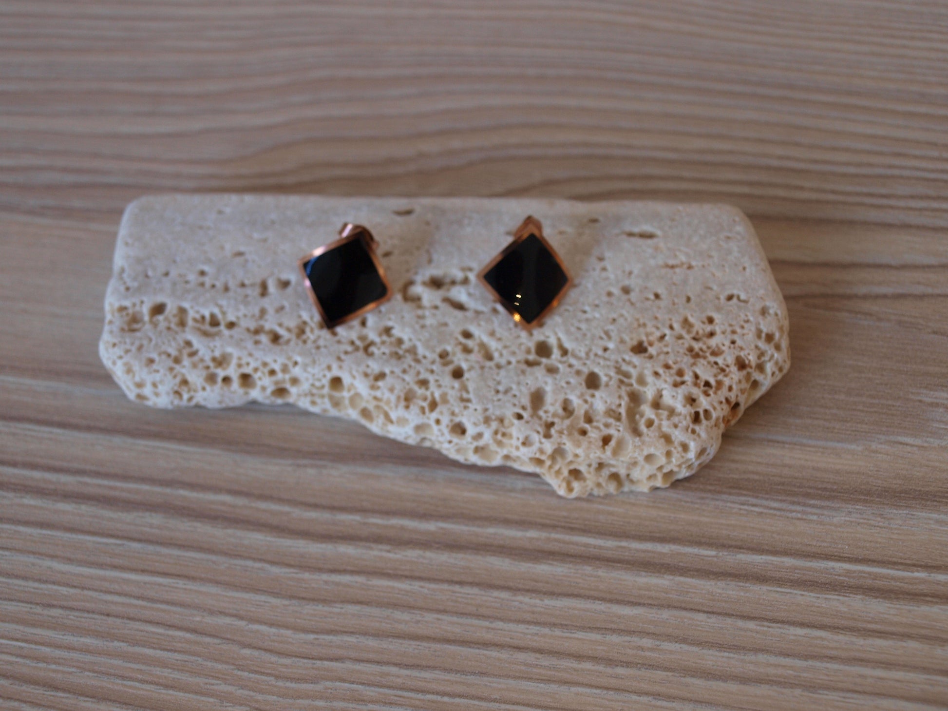 Ove naušnice privlače pažnju zabavnim dizajnom, oblika zakrivljenih kockica s elegantnom crnom oblogom i bakrenim rubovima. Savršene su za one koji vole unijeti malo igre i sjaja u svoj svakodnevni izgled. Dodajte svoj outfit poseban pečat s ovim neobičnim, vibrantnim detaljem!