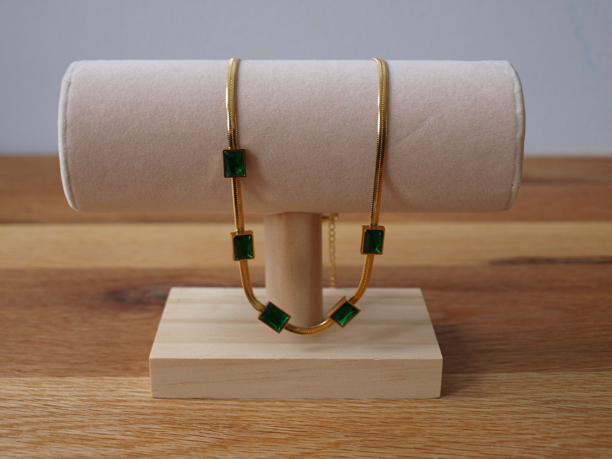 Ovaj lanac sjaji poput zvijezde na posebne prilike, ukrašen zelenim kamenčićima koji blistaju kao tajni šapat prirode. Savršen za dodavanje daška igre i elegancije svakom vašem pokretu!