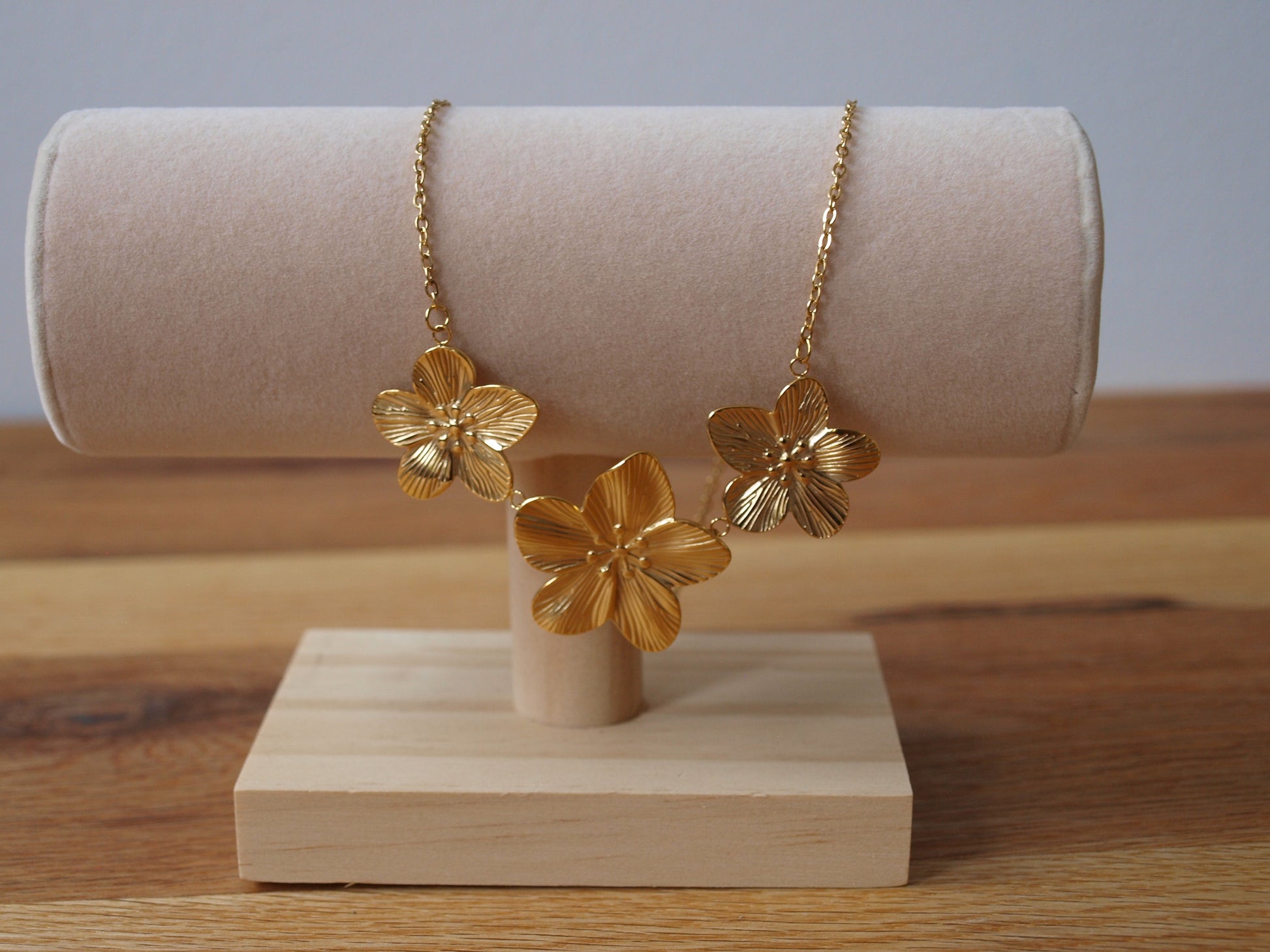 Ova ogrlica s tri predimenzionirana cvijeta u sredini donosi razigran i jedinstven detalj svakom outfitu. Svaki raskošan cvijet sjaji svojim šarmom, stvarajući efektni modni dodatak koji će sigurno privući poglede i razveseliti vas svakim nošenjem. Savršena za one koji vole nositi nešto neobično i veselo!