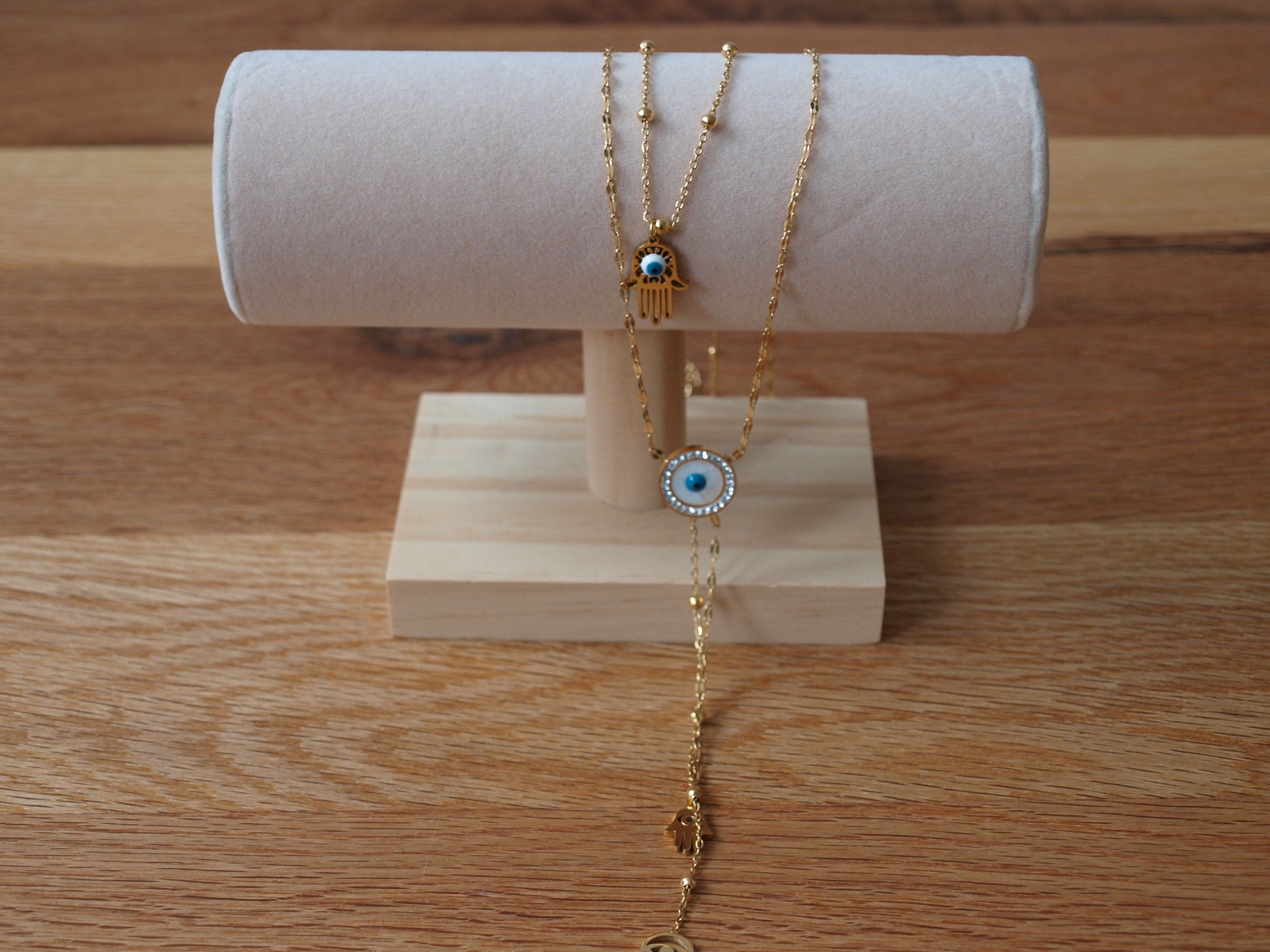 Ova zabavna ogrlica s nekoliko nizova i privjesaka obogaćena zlatnim sjajem ne samo da osvaja izgledom, već i donosi zaštitu od urokljivog oka, čuvajući vas od negativne energije dok sjajite u svakom trenutku. Savršen dodatak za veselje i dobro raspoloženje!