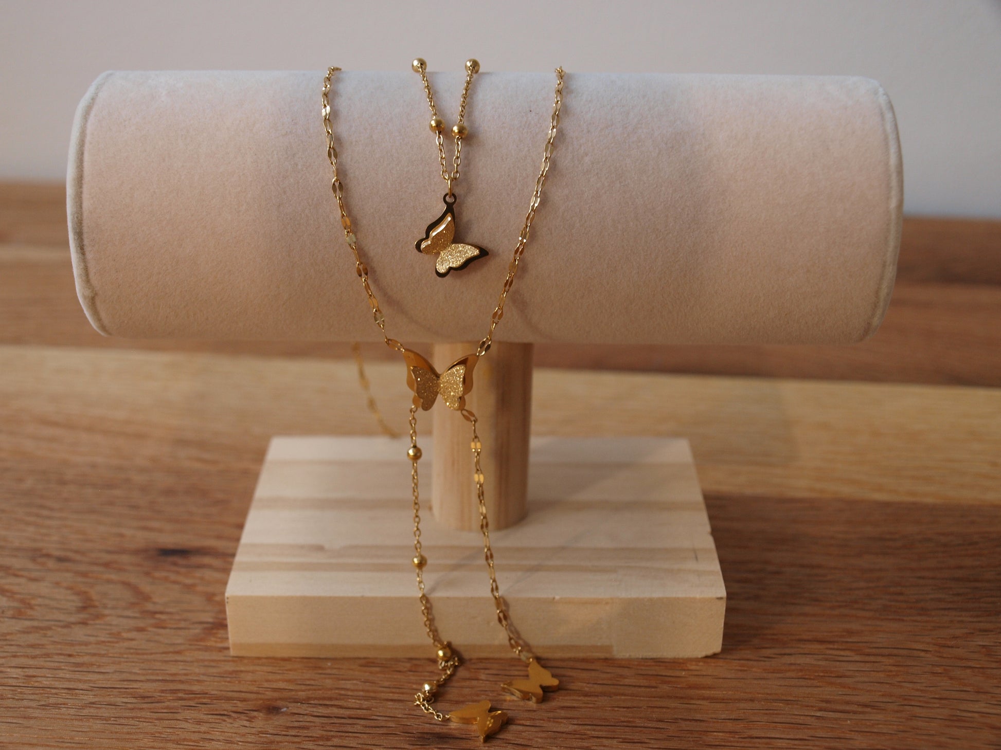Osvježite svoj stil ovom razigranom ogrlicom u dva niza, ukrašenom šarenim privjescima leptira u elegantnoj pozlati. Svaki leptir donosi dozu lakoće i igre, savršeno za dodavanje vedrine svakom outfitu. Idealna je za one koji vole nositi nakit s karakterom i pozitivnom energijom.