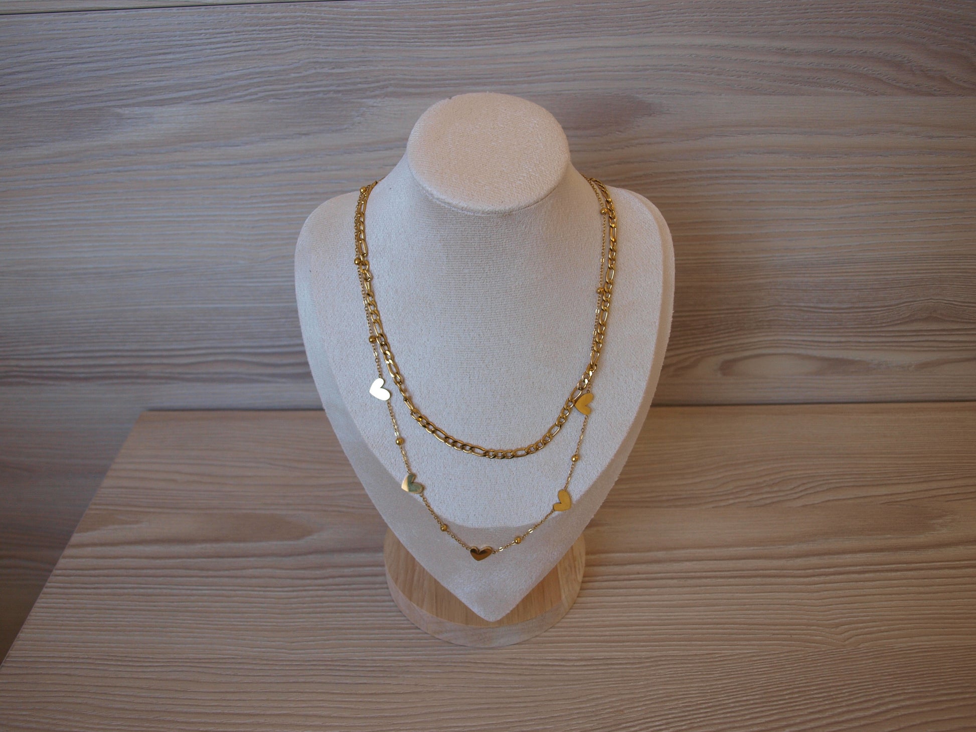 Ova prekrasna ogrlica u dva niza spaja jednostavnost i romantiku u jedinstven dizajn. Prvi niz je elegantan pozlaćeni lančić, dok drugi niz oživljava mnoštvo nježnih privjesaka u obliku srca koji stvaraju šarmantan i zaigran izgled.