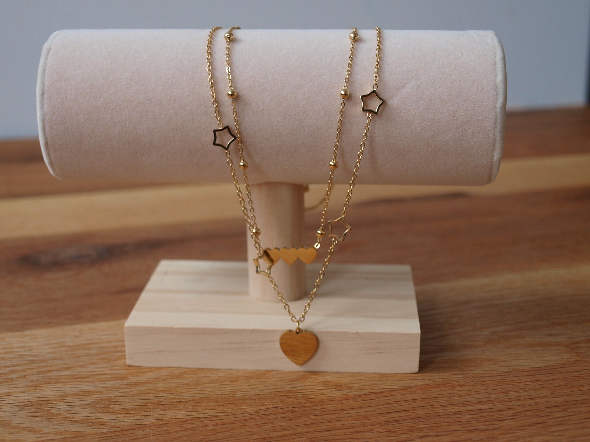 Ova šarmantna ogrlica u dva niza donosi dozu razigranosti i elegancije svakom vašem izgledu. Ukrašena je sitnim srcima, zvjezdicama i malim zlatnim kuglicama, što joj daje jedinstven i privlačan sjaj. Savršena je za one koji vole dodati malo čarolije svojim svakodnevnim kombinacijama. Pozlata joj osigurava dugotrajnost i prekrasan sjaj koji će trajati kroz sve prilike.
