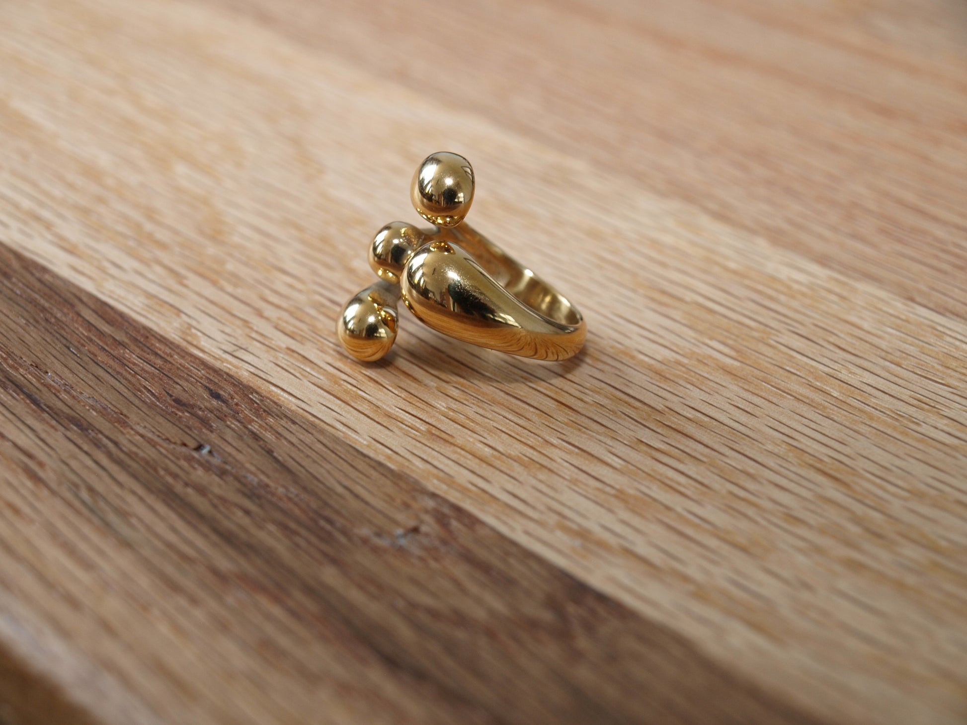 Ovaj prsten ističe se predimenzioniranim dizajnom i četiri otvorena završetka koji stvaraju jedinstvenu, upečatljivu siluetu. Pozlaćena završna obrada naglašava njegovu odlučnost i hrabrost, idealna za one koji žele nositi nešto što ne prolazi nezapaženo. Za drskost s dozom luksuza.
