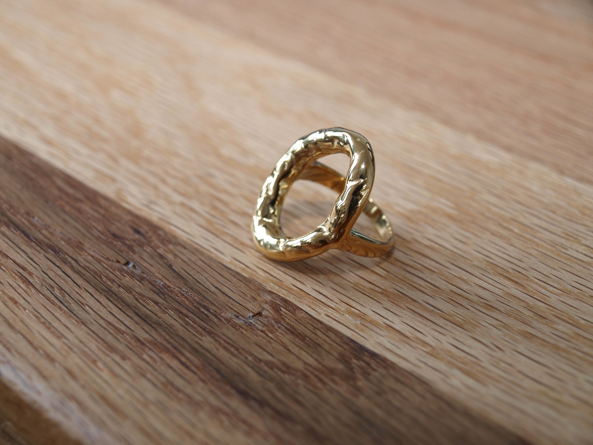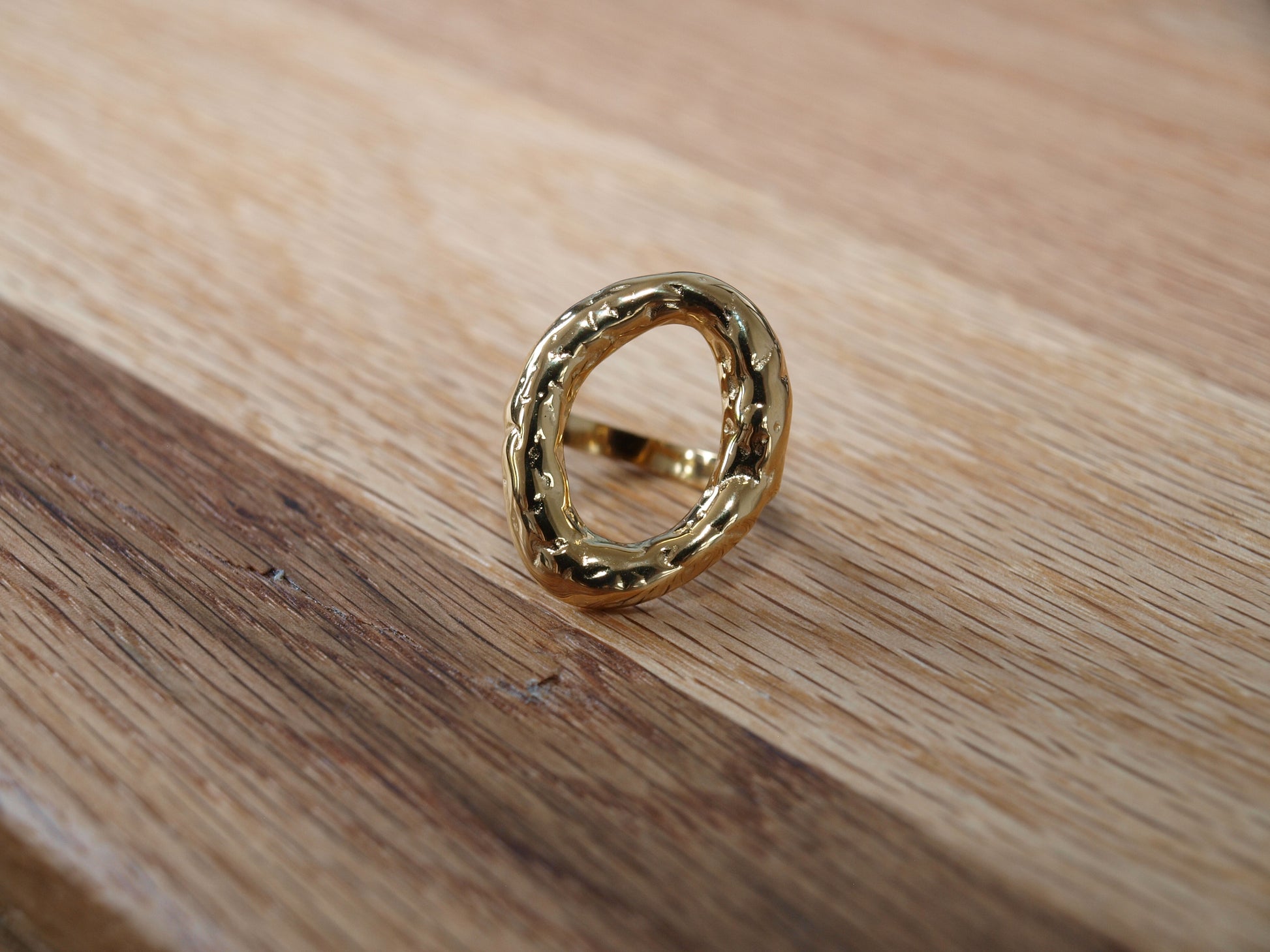 Ovaj hrabri prsten u obliku praznog kruga ističe se upečatljivom pozlatom koja plijeni poglede. Njegov nenametljiv, ali smjeli dizajn savršen je za one koji žele napraviti snažan modni izraz bez previše detalja.