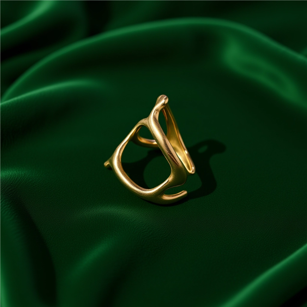 Ovaj prsten nosi dojam istopljenog zlata koje se prirodno prilagođava obliku prsta, stvarajući neobičan i smioni izgled. Njegova pozlata naglašava luksuz i jedinstven stil, idealan za one koji žele izraziti svoju hrabrost i individualnost na neočekivan način.