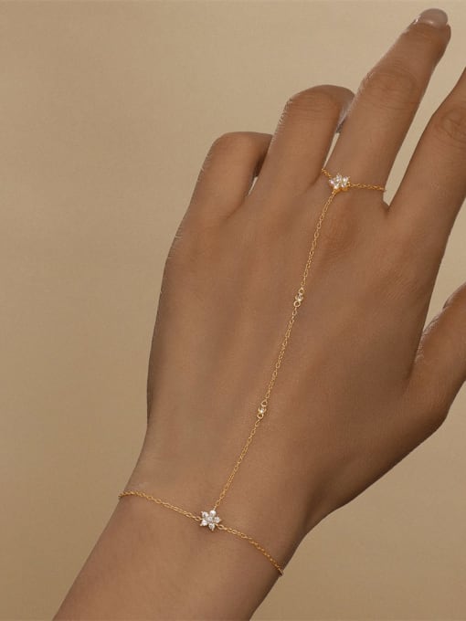 Osvježite svoj izgled s prsten narukvicom koja blista pozlatom i savršeno raspoređenim cirkonimau obliku cvijeta. Ovaj šarmantni ukras za ruku donosi neodoljiv sjaj i veselu energiju svakom vašem pokretu. Neka vaša ruka zablista i privuče poglede!
