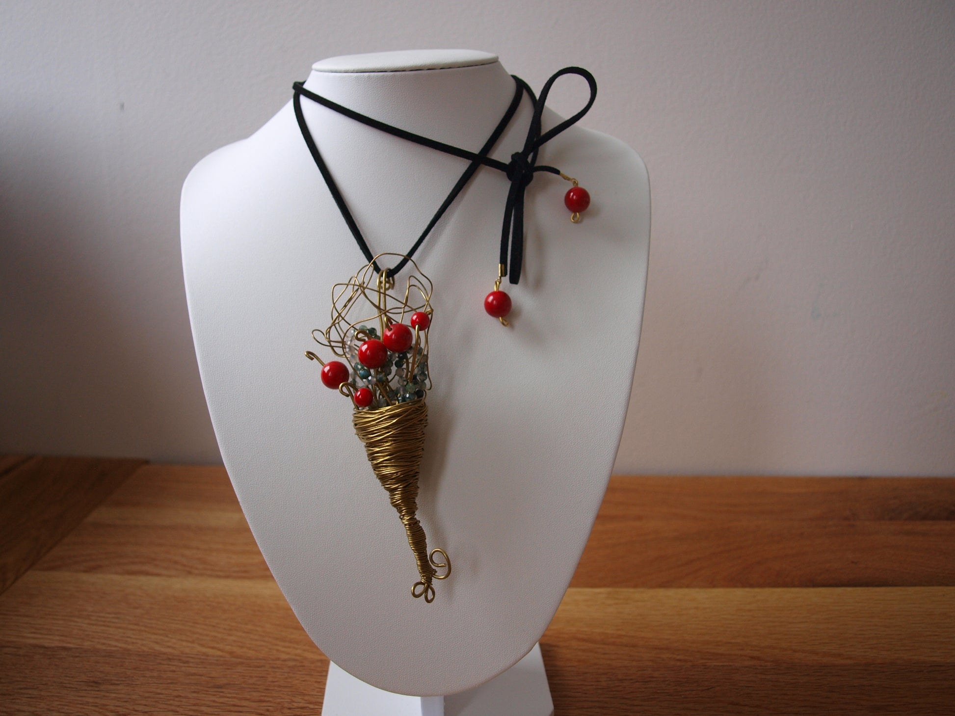 Ova romantična ogrlica s privjeskom u obliku buketa cvijeća spaja umjetnost ručnog rada s prirodnom ljepotom kamenja. Buket je pažljivo oblikovan od mesing žice, imitacije koralja i rubin zoisita, stvarajući buket koji nikada ne vene – vječni simbol ljubavi, strasti i vitalnosti.