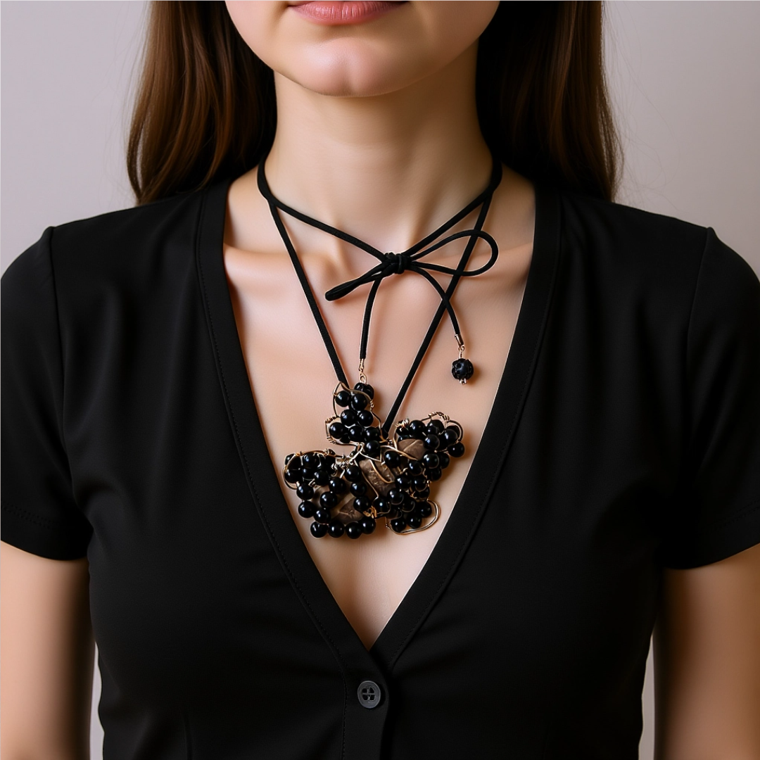 Ova elegantna ogrlica podsjeća na grozdove crnog ribiza – suptilna, sofisticirana i puna prirodne ljepote. Svaka perla od crnog oniksa pažljivo je odabrana i posložena kako bi stvorila harmoničan, organičan izgled koji privlači poglede.
