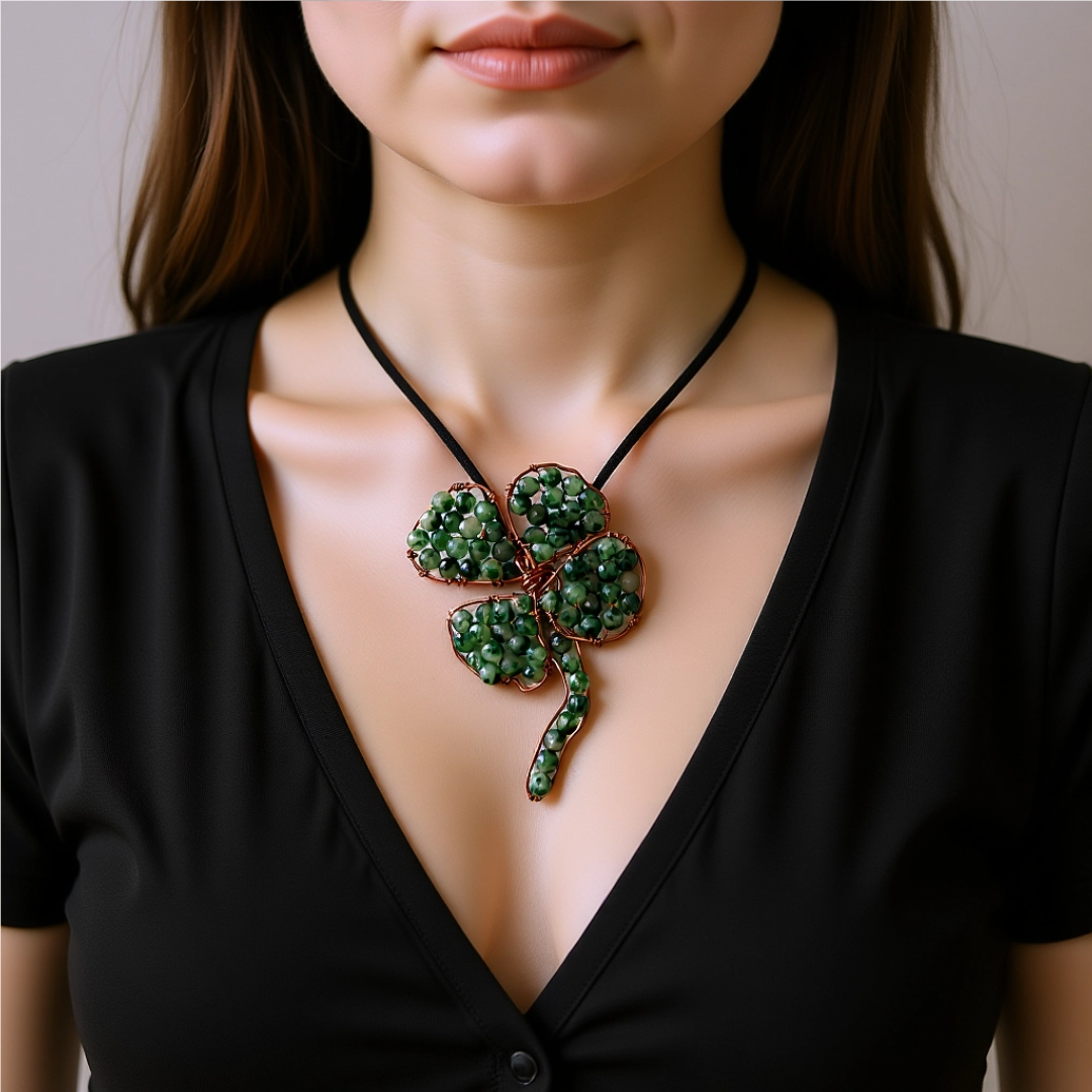 Ova čarobna ogrlica s privjeskom u obliku djeteline sa četiri lista potpuno je izrađena od mahovinastog ahata – kamena koji donosi sreću, obilje i duboku povezanost s prirodom. Svaki list pažljivo je oblikovan kako bi stvorio simbol koji je stoljećima poznat kao nositelj sreće.
