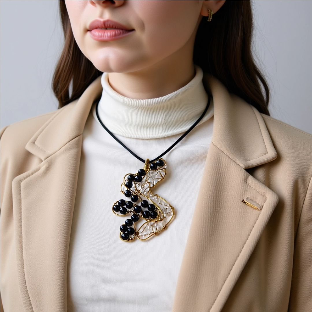 Jin i Jang je ogrlica koja utjelovljuje drevnu mudrost ravnoteže i harmonije. Crni oniks i gorski kristal, ispleteni u mesing žici, stvaraju savršenu simboliku suprotnosti koje se dopunjuju – tame i svjetla, snage i jasnoće, zemlje i neba – u vječnom plesu ravnoteže.