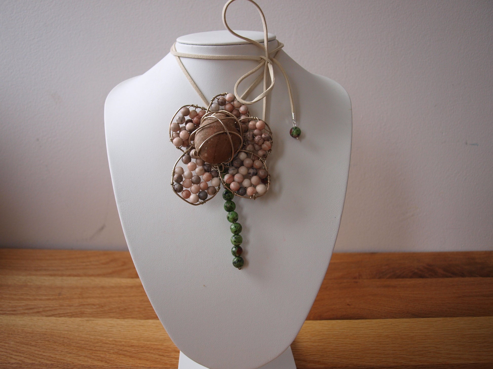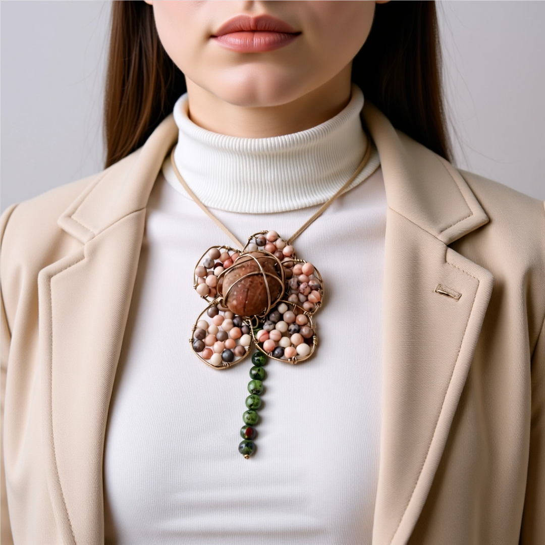 Ovaj veličanstveni privjesak u obliku cvijeta je pravi unikat koji spaja prirodnu ljepotu kamenja s umjetničkom vizijom i dubokim simboličkim značenjem.